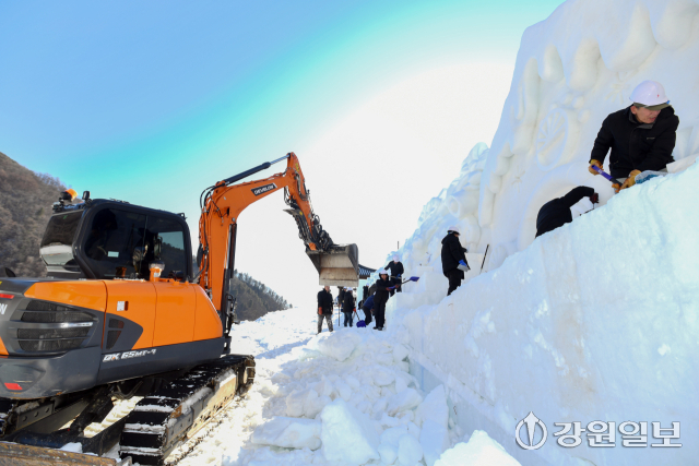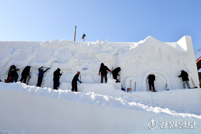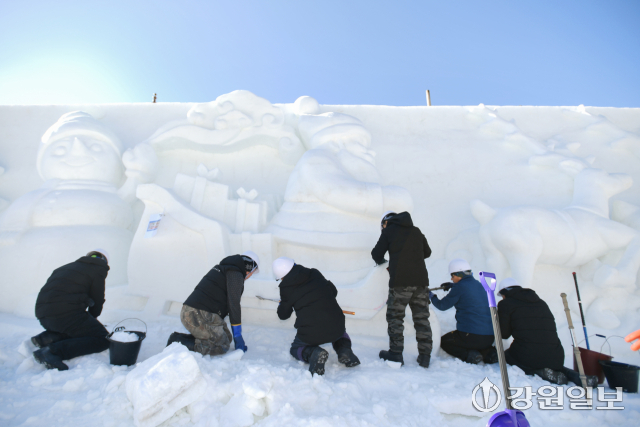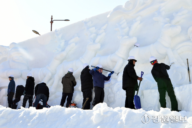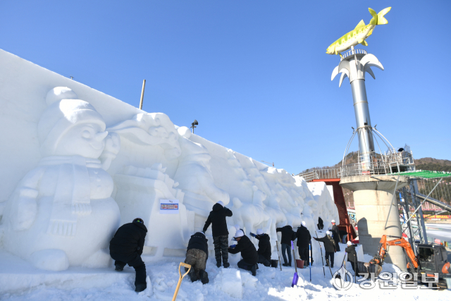 2025년 마지막 날인 31일, 화천산천어축제장에서 축제 개막 열흘을 앞두고 거대한 눈조각 작품 조성이 한창 진행되고 있다. 2026 얼음나라 화천산천어축제는 새해 1월 10일부터 2월1일까지 23일 간 열린다.