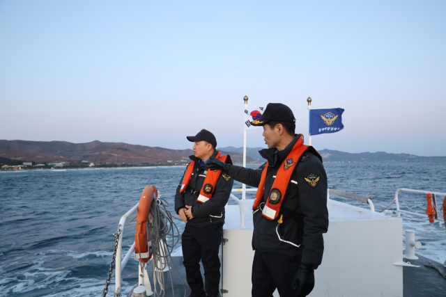 김환경 동해해양경찰서장이 1일 해맞이 안전관리를 위해 동해시 망상해변 앞 해상에서 직접 지휘를 하고 있다.
