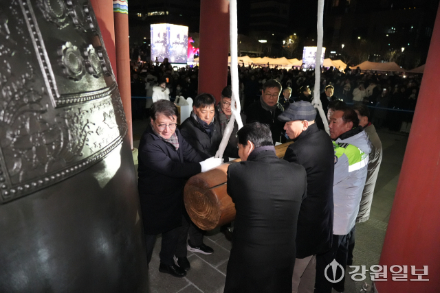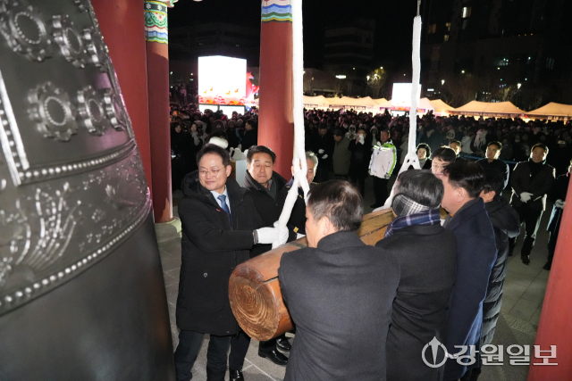 2026 병오년 새해 첫날인 1일 춘천시청광장에서 열린 시민의 종 타종행사에 참석한 육동한 춘천시장, 허영 국회의원, 여중협 강원자치도행정부지사, 김진호 춘천시의장 등이 새해의 시작을 알리는 타종을 하고 있다. <춘천시청제공>2026 병오년 새해 첫날인 1일 춘천시청광장에서 열린 시민의 종 타종행사에 참석한 육동한 춘천시장, 허영 국회의원, 여중협 강원자치도행정부지사, 김진호 춘천시의장 등이 새해의 시작을 알리는 타종을 하고 있다. <춘천시청제공>2026 병오년 새해 첫날인 1일 춘천시청광장에서 열린 시민의 종 타종행사에 참석한 육동한 춘천시장, 허영 국회의원, 여중협 강원자치도행정부지사, 김진호 춘천시의장 등이 새해의 시작을 알리는 타종을 하고 있다. <춘천시청제공>