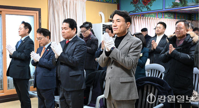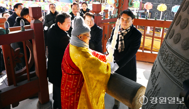 새해맞이 신년하례 범종타종법회가 1일 춘천 석왕사에서 편백운 주지스님, 김윤호 춘천사암연합 신도회장, 김진태 지사, 신경호 교육감, 육동한 시장, 허영 국회의원, 김진호 시의장을 비롯한 내빈과 불자들이 참석한 가운데 열렸다.