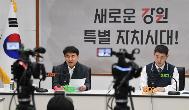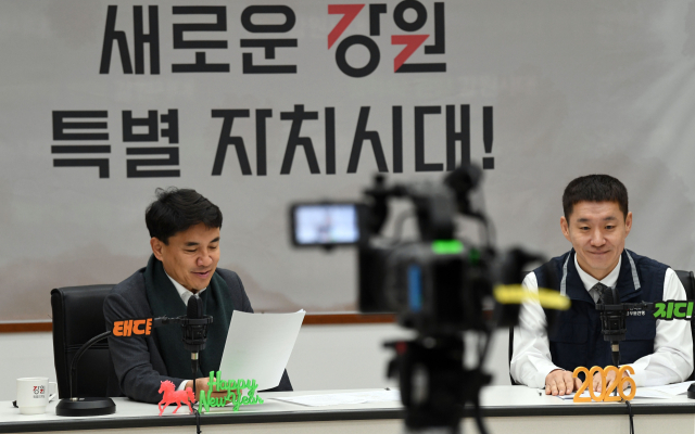김진태 강원특별자치도지사는 2일 도청 본관회의실에서 신지헌 도청노조위원장과 함께 2026년 보이는 라디오 시무식을 진행했다.