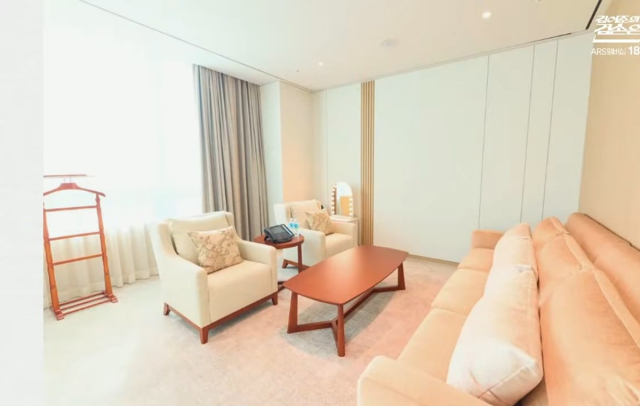 또 다른 사진을 보면 사우나 우측에 달린 문을 열면 화장실이 있고 '킹사이즈'로 추정되는 대형 침대가 있는 침실, 소파가 놓여있는 응접실이 각각 나온다.
