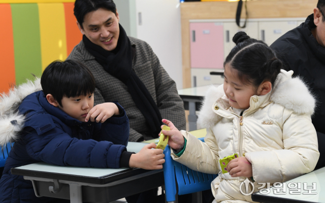 춘천 금병초교 2026학년도 예비소집일인 지난 2일 입학을 앞둔 신입생이 학부모와 함께 처음 방문한 학교 교실을 신기한 듯 둘러보고 있다.