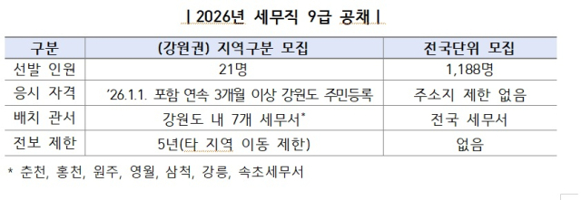 응시자격은 연속 3개월 이상(2026년 1월 1일 포함) 강원도에 주민등록이 돼 있어야 한다. 원서는 2월 2일부터 2월 6일까지 국가공무원채용시스템(gongmuwon.gosi.kr)를 통해 온라인으로 접수한다.