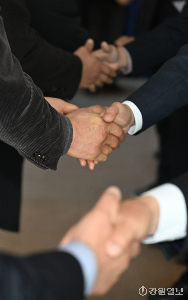 오는 6월 3일 지방선거를 앞두고 후보자들이 얼굴알리기에 분주하다. 5일 라카이샌드파인에서강릉시상공회의소가 주관하는 ‘2026 경제인 신년인사회’에서 지방선거 출마를 앞둔 후보자들이 참석자들에게 악수를 하고 있다. 강릉=권태명기자