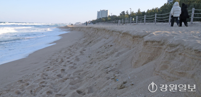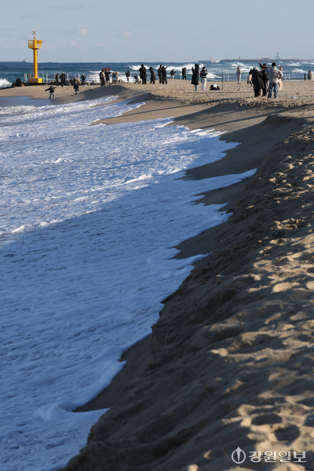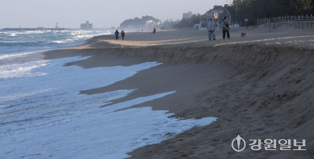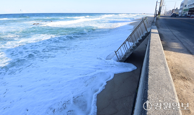 겨울철 풍랑·강풍에 강릉지역 바닷가 해안침식이 더 심각해지는 가운데 5일 강릉시 사천면 하평해변에서 파도가 백사장을 넘어 도로 옹벽까지 밀려오고 있다. 강릉=권태명기자