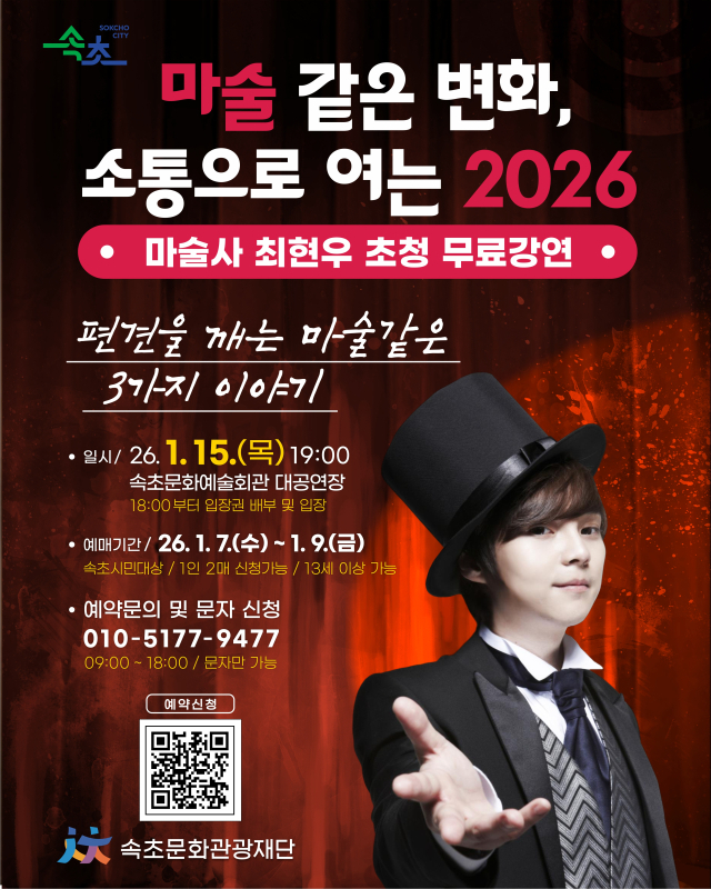 【속초】속초문화관광재단(이사장:이병선)은 오는 15일 오후 7시 속초문화예술회관 대공연장에서 마술사 최현우를 초청해 강연과 퍼포먼스가 결합한 기획공연 ‘마술 같은 변화, 소통으로 여는 2026’을 개최한다.