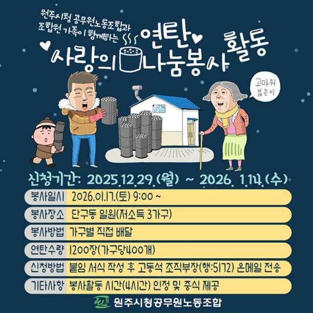 【원주】원주시청 공무원노조(원공노)는 오는 17일 단구동 일원에서 조합원과 가족 등이 참여한 가운데 연탄나눔 봉사활동을 펼친다.