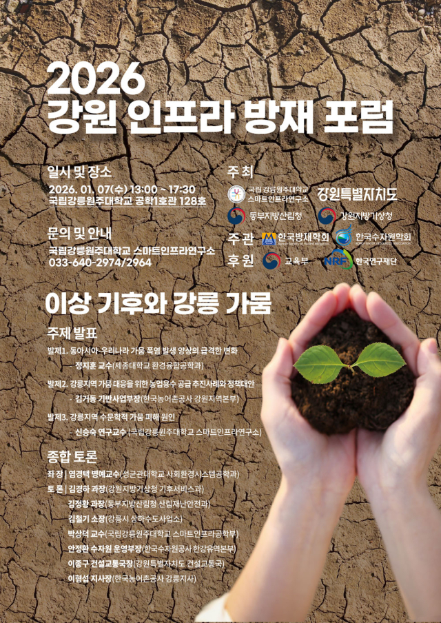 국립강릉원주대 스마트인프라연구소는 강원특별자치도, 동부지방산림청, 강원지방기상청과 공동으로 7일 오후 1시 국립강릉원주대 공학1호관(N11) 128호에서 ‘2026 강원 인프라 방재 포럼’을 개최한다.