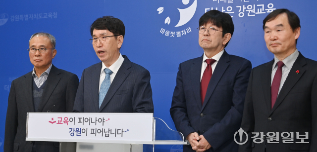 유대균·조백송·주국영·최광익 4명 후보군은 6일 강원도교육청 브리핑룸에서 기자회견을 열고 “민주노총, 전교조의 교육감 후보 단일화 추진 기구를 빙자한 교육감 선거 불법 개입 행위를 강력히 규탄한다”고 밝혔다. 이들은 “교육감 선거는 정당과 정치조직의 개입을 엄격히 배제하고 교육의 정치적 중립성과 자주성을 보장하기 위해 마련된 제도”라며 “민주노총과 전교조는 특정 성향의 후보를 단일화한다는 명분으로 사실상 정치세력화된 조직력을 동원해 선거에 개입하고 있다”고 주장했다.