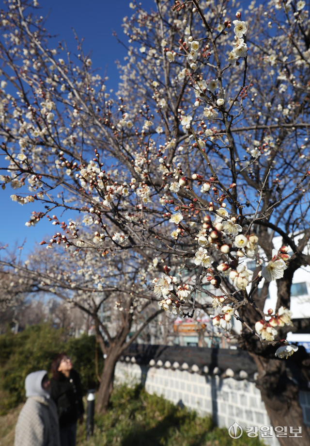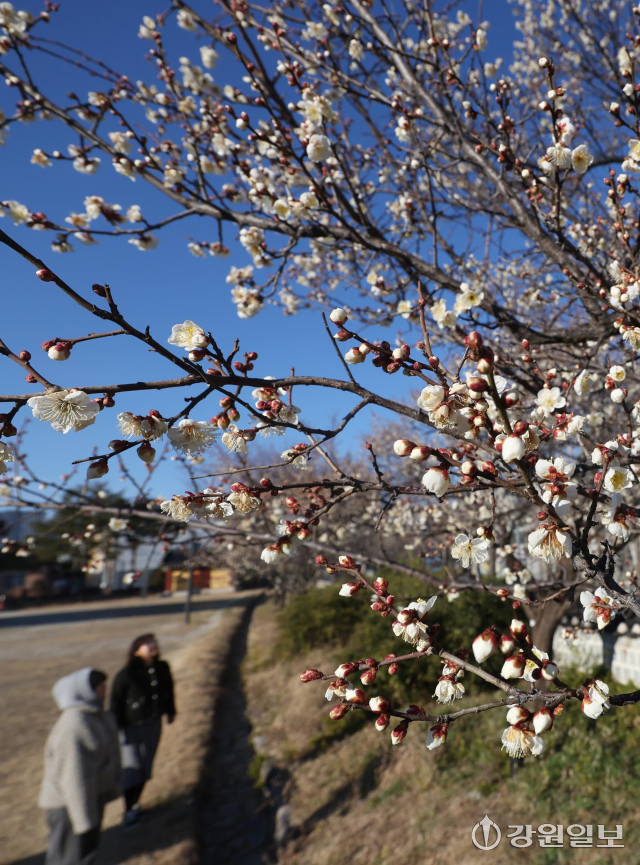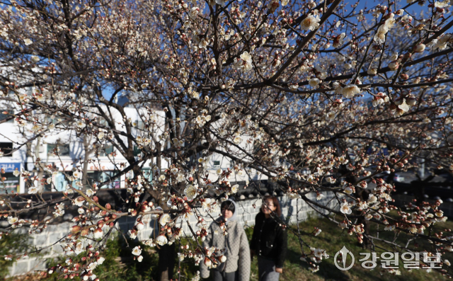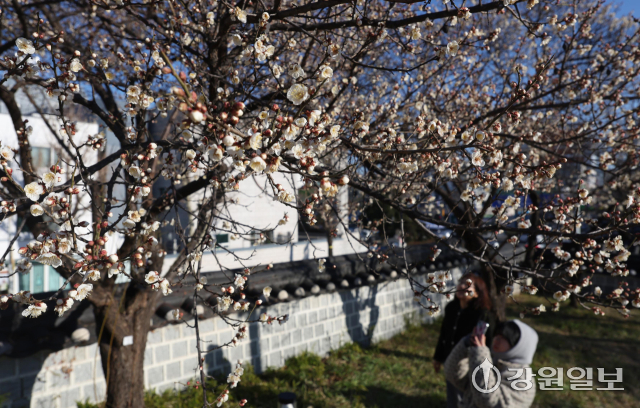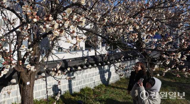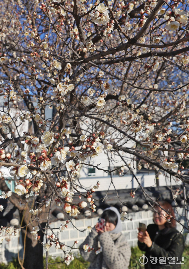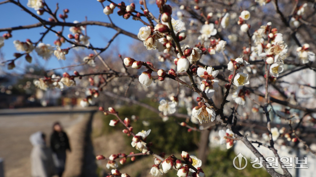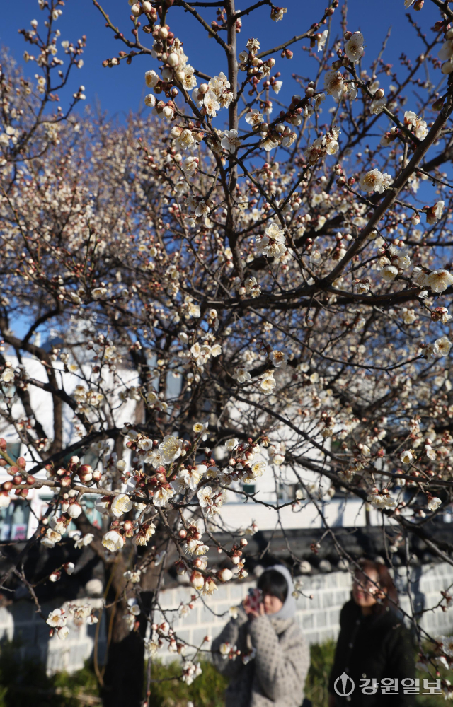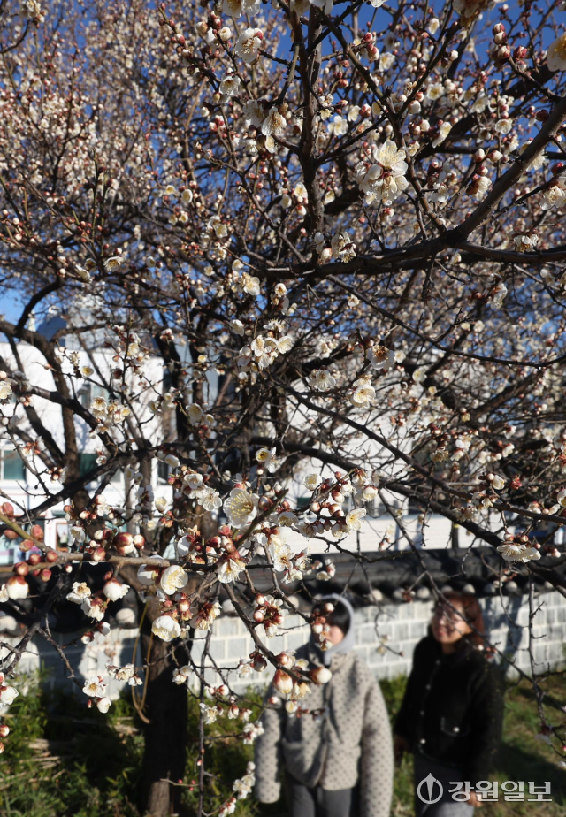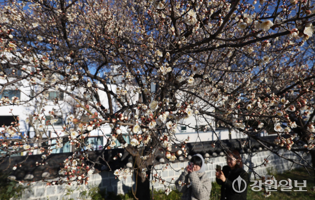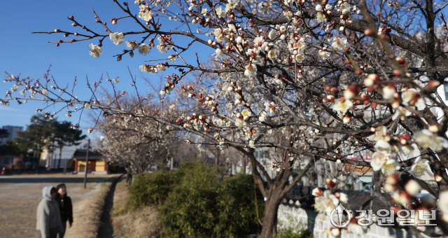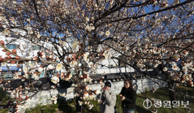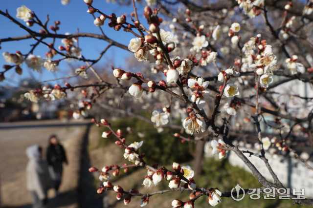 6일 강릉시 용강동에 겨울이나 이른 봄에 가장 먼저 피는 매화가 한파 속에도 활짝 펴 지나는 시민들의 눈길을 사로잡고 있다. 강릉=권태명기자