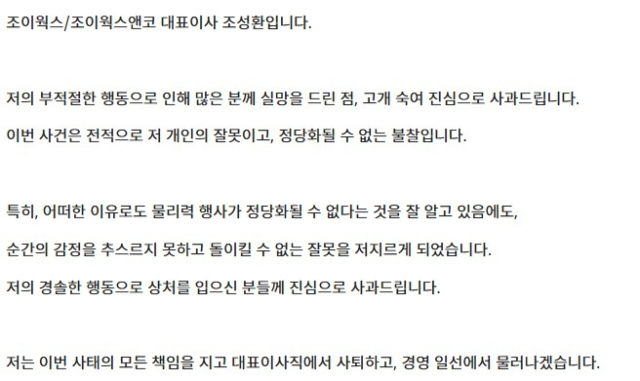 조이웍스앤코는 7일 "조성환 조이웍스앤코 대표는 이번 사건에 대해 전적으로 본인의 잘못임을 인정하고, 대표이사직에서 사퇴하며 경영 일선에서 물러나겠다는 뜻을 밝혔다"고 전했다.