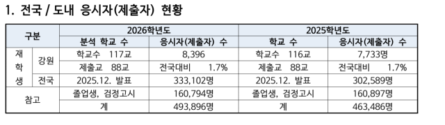한유선 교육국장은 "도내 학생들이 학교 내신뿐 아니라 수능 대응력을 갖출 수 있도록 지원하겠다"며 "공교육의 경쟁력을 높이고 학생 개개인의 잠재력을 키울 수 있는 스공학 프로그램을 개선 및 강화해 가겠다"고 말했다. 한편 2026학년도 수능은 '황금돼지띠' 고3 학령인구 증가의 영향으로 전년 대비 1,106명이 증가한 1만3,080명이 접수, 1교시 기준 결시율은 10.92%로 전년 대비 0.7%포인트 감소했다. 이번 분석은 강원도내 일반고, 자사고, 특목고 등 88개 고교 재학생을 대상으로 집계했으며, 응시 현황, 과목 선택 경향, 영역별 성취 분포 등을 종합적으로 분석했다.