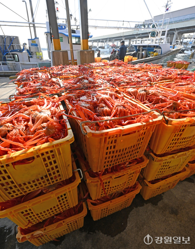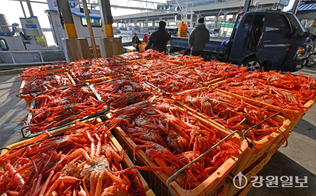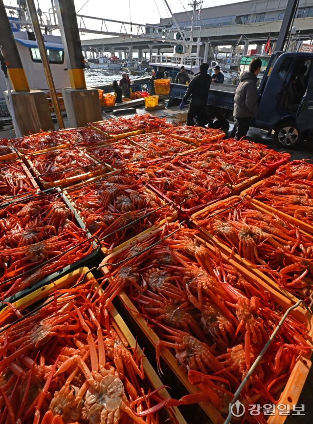 7일 강릉시 주문진항에 어민들이 살이 포실포실 올라 맛이 오른 겨울 제철 홍게를 출하하느라 분주하다. 강릉=권태명기자