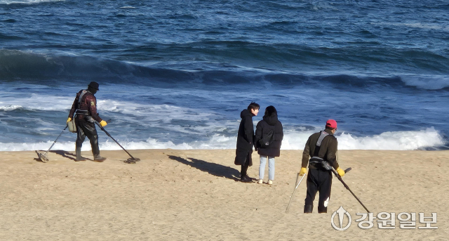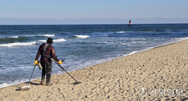 금값 고공행진이 이어지는 가운데 8일 강릉의 한 해변 백사장에서 주민이 금속 탐지기를 이용해 금붙이 등을 찾고 있다. 강릉=권태명기자