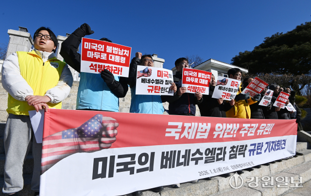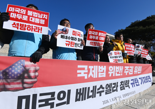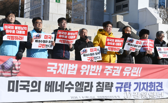 강원연석회의와 강원비상행동은 8일 강원특별자치도청 앞에서 열린 기자회견에서 미국의 베네수엘라 침공을 강력 규탄하고 있다.