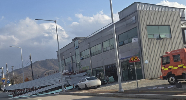 ◇강원특별자치도내 전역에 강풍 특보가 내려진 지난 10일 오후 3시17분께 횡성읍 읍상리에서 건물 지붕 철골조 구조물이 강픙에 날려 건물 아래 도로를 덮쳤다. 이 사고로 다친 사람은 없었지만 구조물이 주차된 차량 위로 떨어지면서 차량 일부가 파손됐다. 사진=횡성소방서 제공