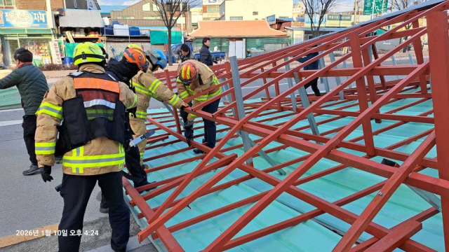 ◇강원특별자치도내 전역에 강풍 특보가 내려진 지난 10일 오후 3시17분께 횡성읍 읍상리에서 건물 지붕 철골조 구조물이 강픙에 날려 건물 아래 도로를 덮쳤다. 이 사고로 다친 사람은 없었지만 구조물이 주차된 차량 위로 떨어지면서 차량 일부가 파손됐다. 출동한 소방관들이 건물 잔해를 정리하고 있다. 사진=횡성소방소 제공