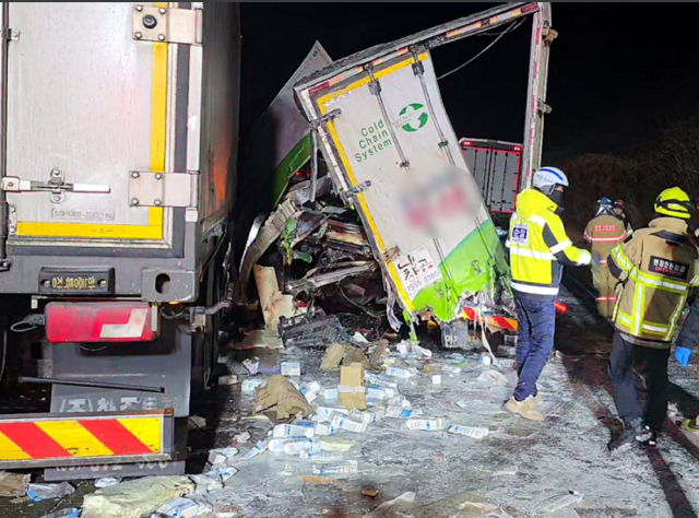 ◇12일 오전 2시 46분께 청주시 상당구 문의면 서산영덕고속도로 청주 방향 문의청남대휴게소 인근에서 14t, 2t, 9t, 8.5t 화물차 4대가 잇따라 추돌했다. 이 사고로 1명이 심정지 상태로, 3명은 중경상을 입고 병원으로 이송됐다.[독자 제공. 재판매 및 DB 금지]