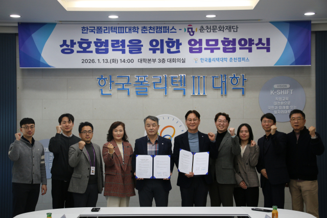 한국폴리텍Ⅲ대학(학장:지경배) 춘천캠퍼스는 13일 대학본부 대회의실에서 춘천문화재단(이사장:박종훈)과 평생직업교육 활성화와 문화예술 관람 지원을 위한 상호협력 업무협약(MOU)을 체결했다. 이번 협약을 통해 양 기관은 지역사회 구성원의 학습 기회와 문화 접근성 확대를 위한 협력에 나선다.