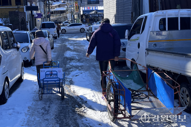 간밤에 내린 눈이 얼어붙은 13일 오후 춘천시 운교동의 한 고물상에 박모씨가 폐지를 잔뜩 실은 리어카를 끌고 왔다. 영하 10도의 한파를 견디기 위해 여러겹의 점퍼와 귀마개, 장갑으로 무장한 박씨가 가져온 폐지는 40여㎏. 이틀간 모았지만 이날 박씨의 손에는 2,500원만이 쥐어졌다. 박씨는 “눈길이 위험해 오후에야 나오면서 폐지를 많이 가져오지 못했다”면서 답답해 했다.
