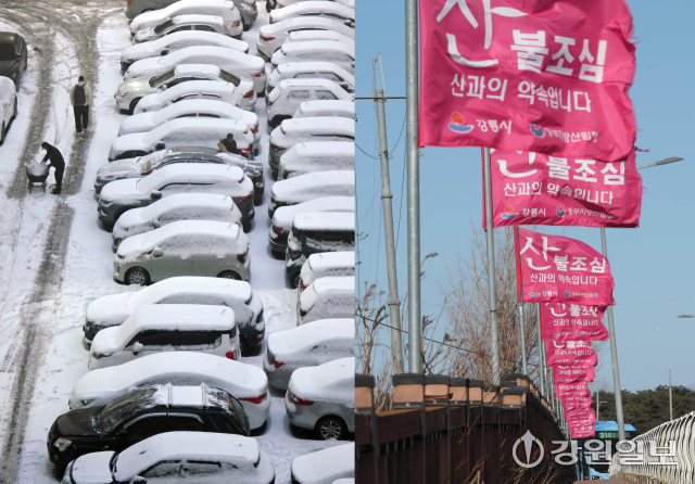 최근 강원 영서지역은 많은 눈이 내리면서 대설주의보가 내려진 반면 영동지역엔 건조한 날씨가 이어지며 산불 위험이 높아지고 있다. 13일 밤사이 많은 눈이 내린 춘천시 후평동의 한 아파트 주차장에 눈을 치우는 시민들의 모습과 대조적으로 강릉시 사천면 도로변엔 산불조심 현수막이 바람에 나부끼고 있다.