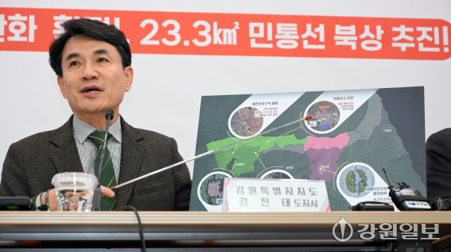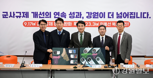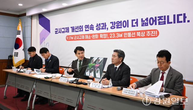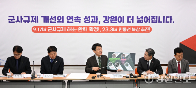 김진태 강원특별자치도지사와 서흥원 양구군수, 함명준 고성군수, 유광종 철원부군수는 14일 도청 브리핑룸에서 ‘군사시설보호구역 규제개선 현황’을 발표했다.