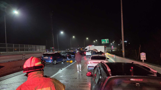15일 새벽 2시44분께 정선군 남면 국도 38호선 증산교차로 인근에서 SUV 차량이 중앙분리대를 들이받았다. 이어 현장 수습을 위해 서행을 유도하는 순찰차를 뒤따르던 차량 6대가 잇따라 부딪혔다.