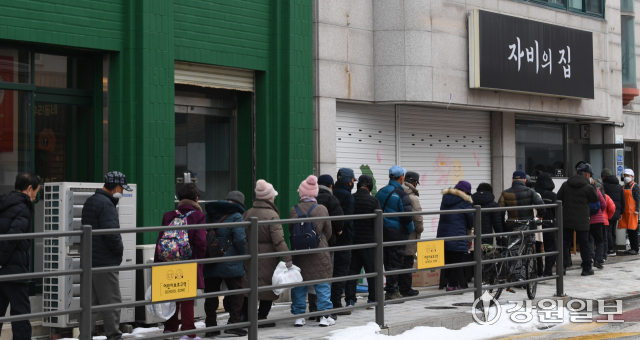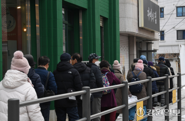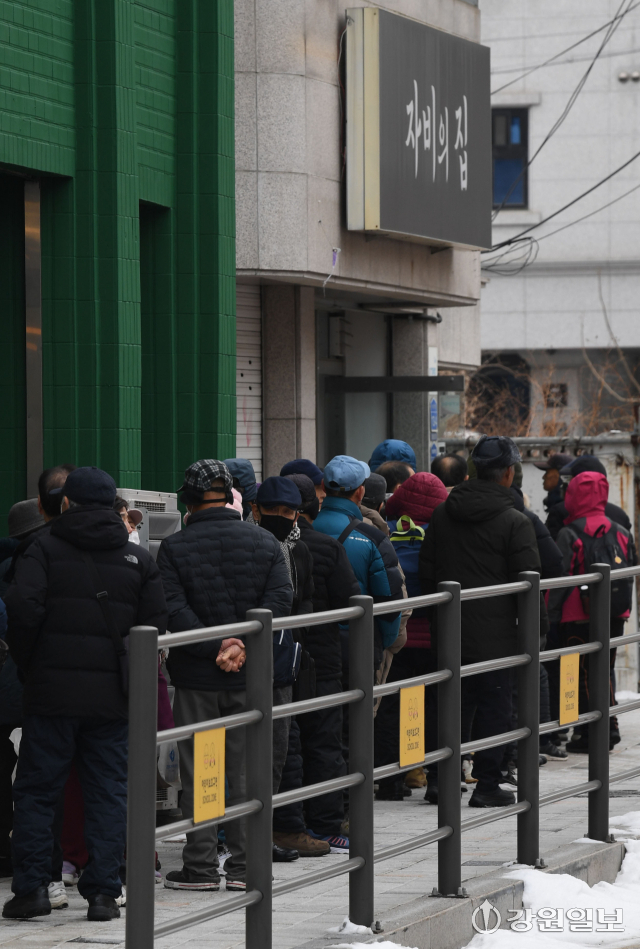 최근 전반적인 물가상승과 함께 서민경기가 어려워지면서 무료급식소를 찾는 시민들이 늘고 있다. 15일 춘천시 무료급식소 '자비의 집' 앞에 무료급식을 받으려는 시민들이 길게 줄지어 서 있다.