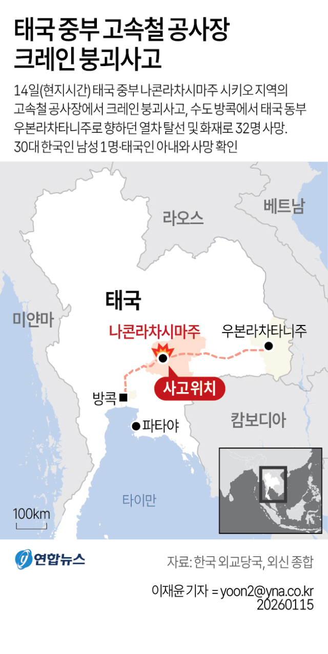 15일(현지시간) 한국 외교당국 등에 따르면 전날 태국 중부 나콘라차시마주 고속철 공사장에서 발생한 열차 사고 사망자 중 30대 후반 한국인 A씨와 그의 태국인 아내가 포함됐다.
