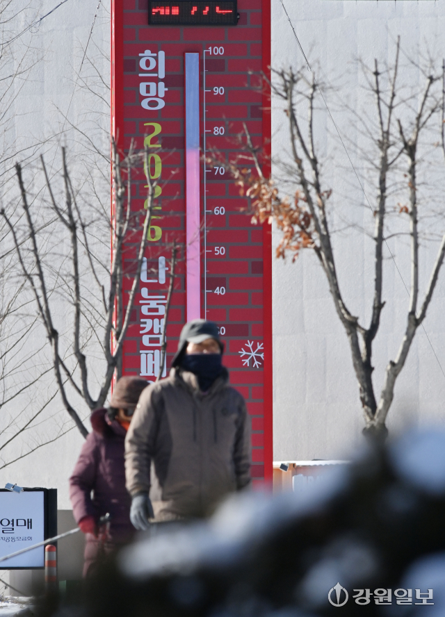 "희망 2026 나눔캠페인" 마감일이 다가오고 있는 가운데 서울과 수도권을 비롯한 주요 도시의 '사랑의 온도탑'이 100도를 달성했거나 근접하고 있는 반면 기부 한파에 어려움을 겪고 있는 강원지역은 15일 오전 기준 여전히 80도를 넘어서지 못한 채 머물러 있다.