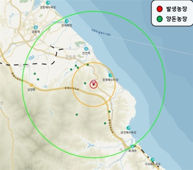 이번 ASF 발생은 2024년 11월 홍천군 발생이후 1년2개월 만이다. 지난 16일 농장주가 돼지 폐사를 확인해 동물위생시험소 동부지소에 신고함에 따라 가축방역관이 혈액 등 시료를 채취해 정밀검사를 실시한 결과 17일 새벽 1시께 확진 판정이 내려졌다.