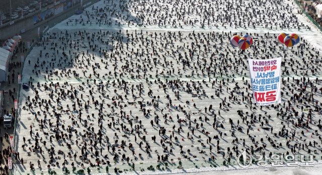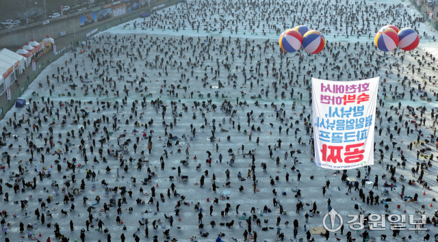 【화천】화천산천어축제장에서 진짜 산타가 등장하며 축제 분위기가 최고조에 달하고 있다. 짜릿한 손 맛을 낚는 구름인파가 몰리며 이번 주말에 누적 관광객 60만 돌파가 예고되고 있다.