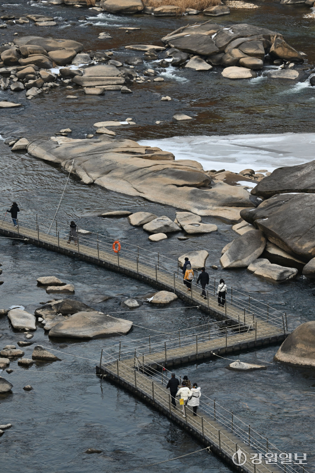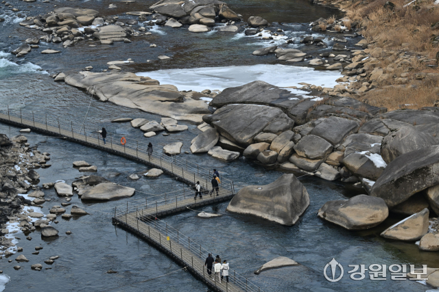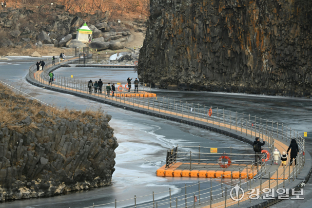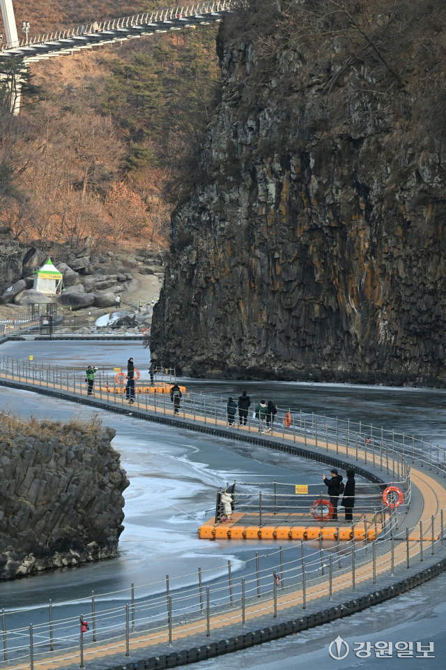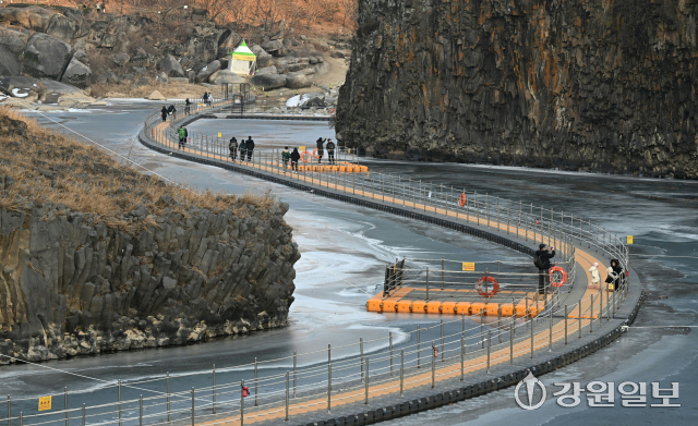 17일 철원군 한탄강 일원에서 개막한 '2026 철원 한탄강 얼음 트레킹 축제'를 찾은 탐방객들이 강물위에 설치된 부표를 따라 걸으며 한탄강의 절경을 만끽하고 있다. 세계 유네스코 지질공원으로 등재된 한탄강의 주상절리를 가까이에서 즐길 수 있는 이번 축제는 오는 25일까지 열린다.