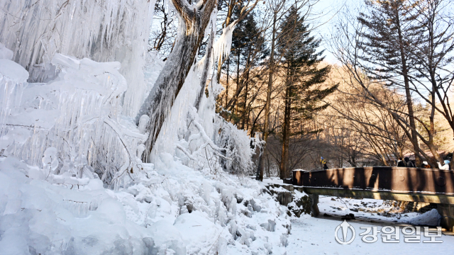 최강 한파가 시작된 20일 춘천 구곡폭포 등산로 입구에서 얼어붙은 고드름이 추위를 실감케 하고 있다.