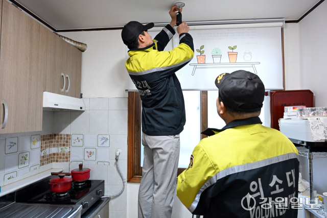 첫 번째로 방문한 곳은 춘천중앙시장 인근 쪽방촌. 배모(여·40)씨의 집은 먼지가 수북이 쌓인 콘센트, 벽지와 맞닿을 듯 놓인 휴대용 가스레인지, 설치되지 않은 화재 경보기 등으로 언제든 대형 화재 위험에 노출된 상태였다. 걱정어린 표정을 짓던 조규연 부대장은 배씨의 집 곳곳에 화재 경보기와 자동소화 멀티탭, 자동소화패치 등 화재 예방 물품을 설치하며 화재 취약 요소를 하나씩 제거해 나갔다.