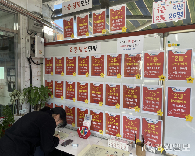 22일 오전 11시께 찾은 춘천 우두동의 한 복권판매점. 자그마치 1등을 4번, 2등을 26번이나 배출해 ‘로또 명당’으로 소문난 이곳은 이른 아침부터 시민들의 발길이 끊이지 않았다. 아침 최저기온이 영하 16도까지 떨어진 맹추위에도 불구, 두꺼운 패딩과 장갑, 목도리로 중무장한 시민들이 20분 사이 30명이나 판매점 문턱을 넘었다.
