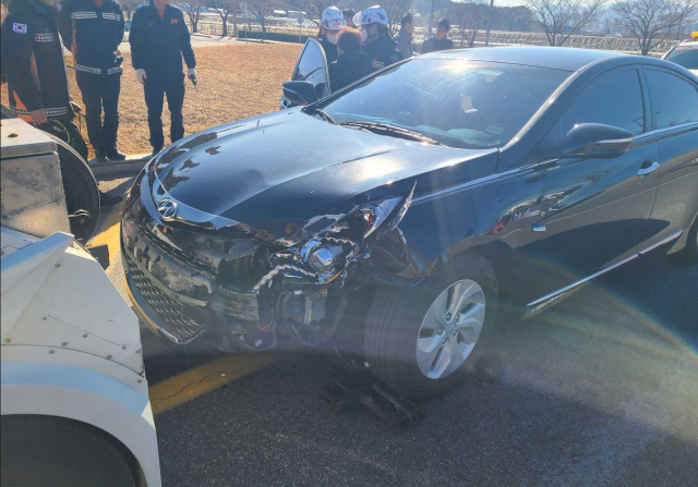 ◇22일 오후 1시25분께 강릉시 교동 운정교 인근 삼거리에서 폭스바겐 승용차와 소나타 승용차가 부딪쳐 1명이 경상을 입었다. 사진=강원특별자치도소방본부 제공