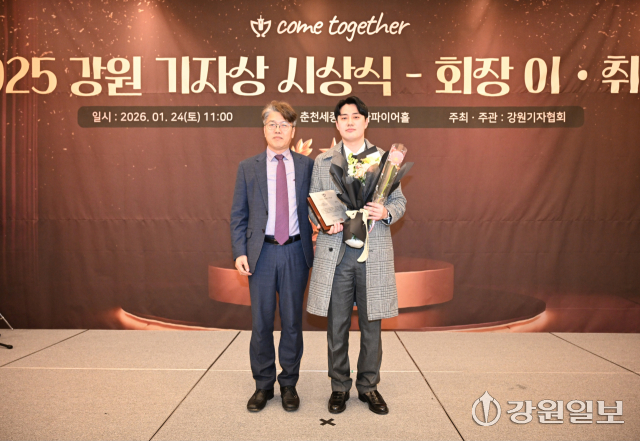 최기영 강원일보 정치부 부장(오른쪽부터)과 손지찬 강원일보 사회체육부 기자가 24일 춘천 세종호텔에서 열린 2025 강원기자상 시상식에서 기획취재 부문을 수상했다. 신세희기자