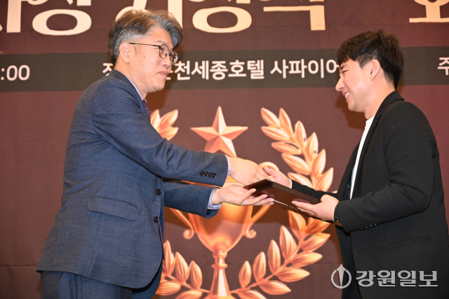 이은호 강원일보 사회체육부 기자(오른쪽)가 24일 춘천 세종호텔에서 열린 2025 강원기자상 시상식에서 일반취재 부문을 수상했다. 신세희기자