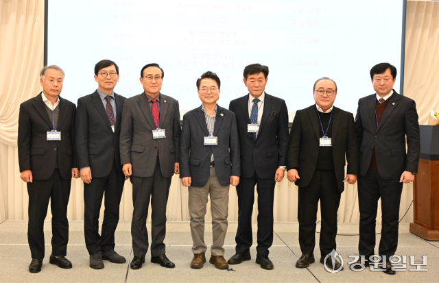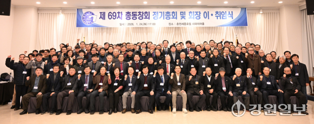 춘천고 총동창회 2026년 제69차 정기총회 및 회장 이·취임식이 24일 춘천 세종호텔에서 김경수 이임회장, 유도현 신임회장을 비롯한 동문과 이상철 교장, 김진태 지사, 신경호 교육감, 육동한 시장 및 내빈들이 참석한 가운데 열렸다. 신세희기자24일 춘천 세종호텔에서 열린 춘천고 총동창회 2026년 제69차 정기총회 및 회장 이·취임식에서 김경수 이임회장(오른쪽)이 유도현 신임회장에게 총동창회기를 이양하고 있다. 신세희기자유도현 신임회장이 24일 춘천 세종호텔에서 열린 춘천고 총동창회 2026년 제69차 정기총회 및 회장 이·취임식에서 취임사하고 있다. 신세희기자춘천고 총동창회가 24일 세종호텔에서 제69차 정기총회를 열고 재단법인 상록글로벌미래재단 설립을 위한 발기인을 소개하고 있다. 발기인은 김경수 호반의료재단 이사장 및 춘천고동창회관 건립추진위원장(49회), 신용준 춘천미래동행재단 이사장(44회), 육동한 춘천시장(50회), 정수복 윤서병원 병원장(52회), 유도현 유성농원 대표 및 춘천고 총동창회 36대 회장(56회), 김희철 강원도의원, 최대식 스카이컨벤션웨딩홀 대표다. 신세희기자