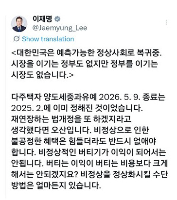 이 대통령은 이날 다시 엑스(X·옛 트위터)에 글을 올려 "다주택자 양도세 중과 유예가 5월 9일에 종료되는 것은 지난해 이미 정해진 일"이라며 제도를 유예하지 않고 폐지하겠다는 뜻을 다시 밝혔다.