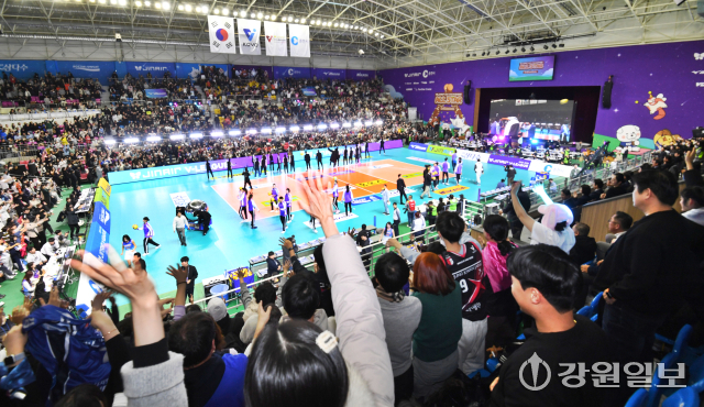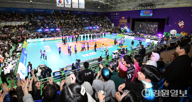 진에어 2025~2026 V-리그 올스타전이 25일 춘천 호반체육관에서 열려 행사장 입구가 경기를 관람하고 이벤트에 참여하기 위해 찾은 시민들로 붐비고 있다. 이번 행사는 춘천시의 유치신청으로 지난해 열릴 예정이었으나 무안공항 참사로 취소됐다가 2년 만에 춘천에서 다시 열리게 됐다. 박승선기자