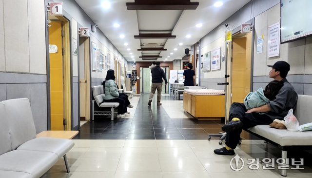 24일 오후 5시께 찾은 춘천 석사동의 한 소아청소년과. 대부분 발열과 기침 등 감기 증세로 대기석에 앉아있는 2~3명의 부모들은 아이를 업고 진료를 기다리고 있었다. 대기석에는 마스크를 쓴 아이가 기침 할 때 인상을 찌푸렸고 밤낮을 가리지 않고 힘겨워하는 아이들이 안색이 좋지 않자 부모들도 당황해 하며 아이를 달랬다.