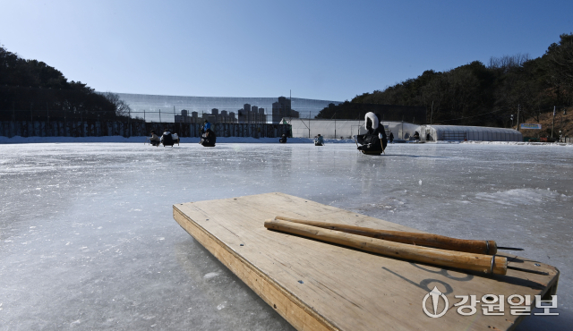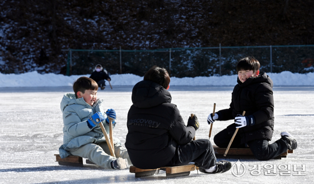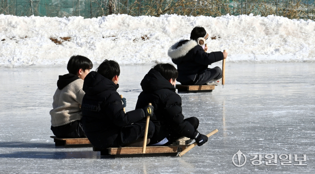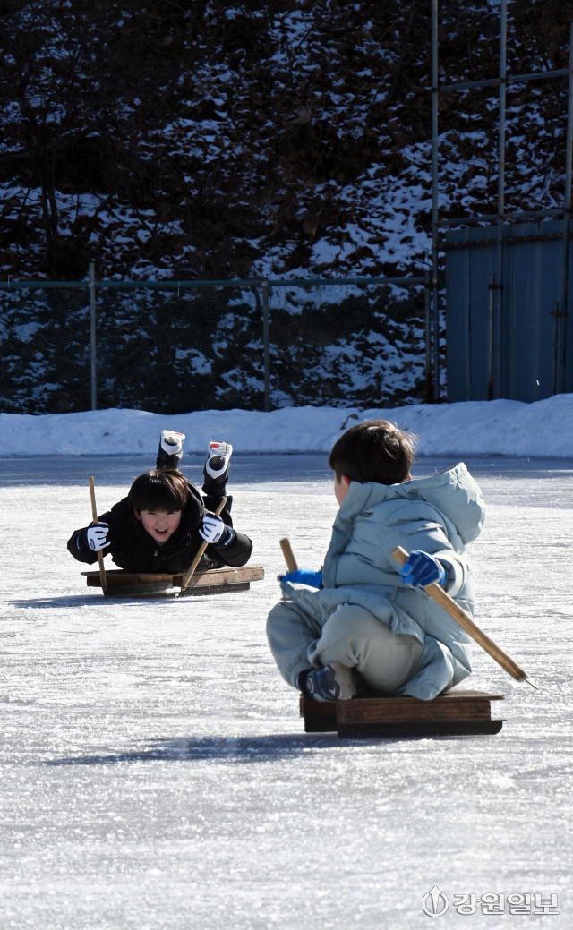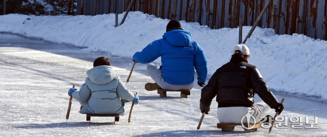 26일 춘천시 석사동의 한 얼음 썰매장에서 아이들과 시민들이 얼음 썰매를 타며 겨울놀이를 즐기고 있다.