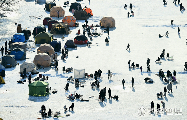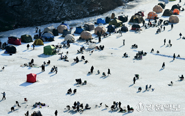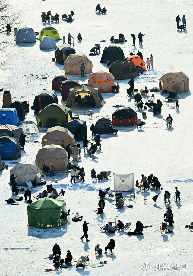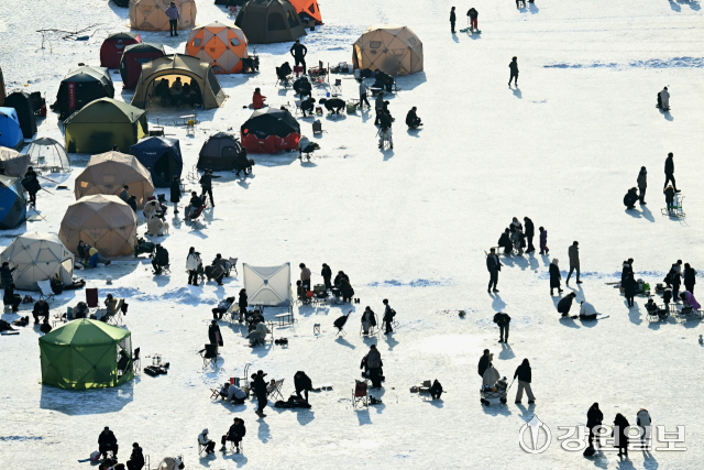 강과 호수가 많은 강원지역이 겨울철 얼음낚시를 즐기기 위한 여행지로 인기를 끌고 있다. 25일 춘천시 서면 오월리 호수를 찾은 관광객들이 빙어낚시와 썰매를 타며 강원의 겨울을 즐기고 있다.