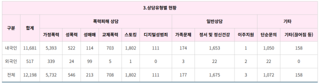 26일 여성긴급전화1366 강원센터의 지난해 상담 유형을 분석한 결과, 전체 1만2,198건의 상담 중 가정폭력 피해는 5,732건(47%)에 달했다. 이어 스토킹(1,802건), 정서 및 정신건강(1,675건), 교제폭력(708건), 성폭력(546건) 등의 이유로 상담이 진행됐는데, 여전히 가정폭력이 절반에 가까운 비중을 차지했다.