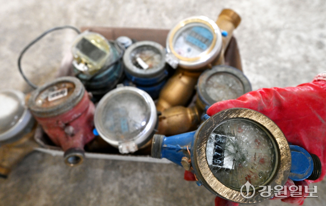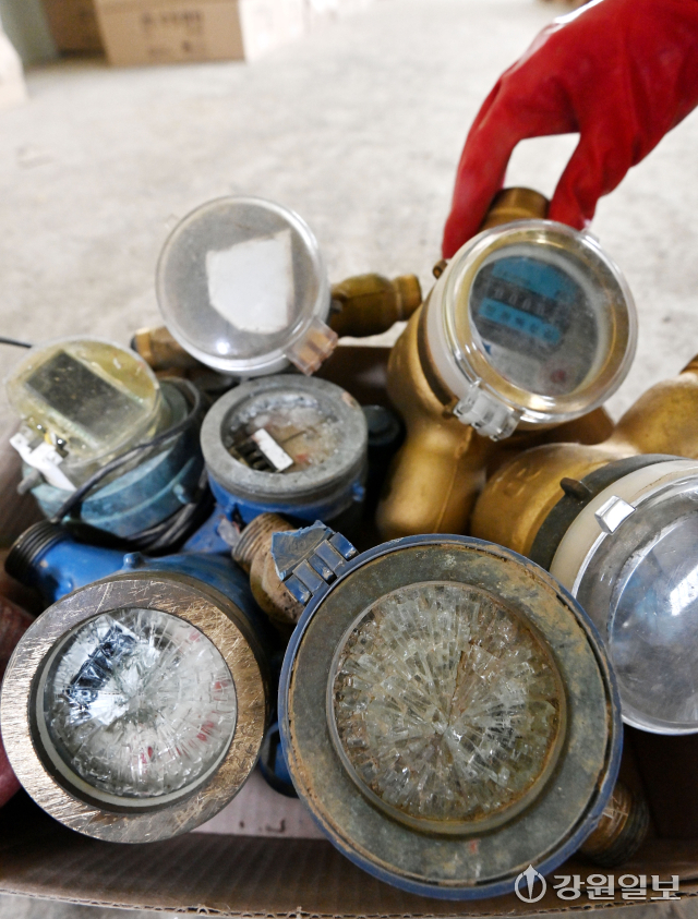 한파가 이어지고 있는 가운데 26일 춘천시수도사업소에서 관계자가 동파된 계량기를 정리하고 있다. 임도혁기자