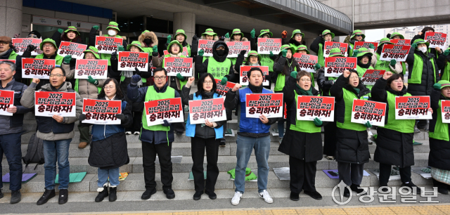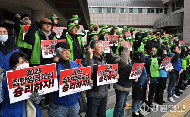 민주노총 공공운수노조 전국교육공무직강원지부는 26일 도교육청 앞에서 명절휴가비 정률제 거부 교육청 규탄 및 교육감 직접 임금교섭 해결 요구 결의대회를 열었다.