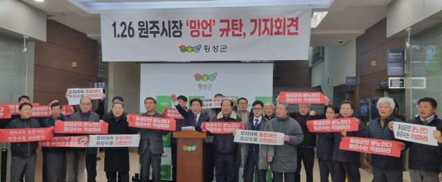 횡성군이장연합회도 이날 원주시장 규탄문을 통해 "원주시장의 26일 브리핑은 횡성을 '원주의 뒷마당'쯤으로 여기는 오만한 태도 그 자체였다"며 "횡성군민을 무시하는 원주시장은 즉각 사죄하고 횡성의 주권을 빼았으려는 통합 논의를 즉각 중단하라"고 규탄했다.